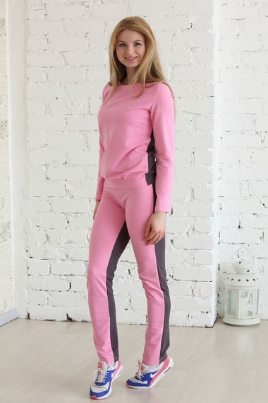 Удобный женский костюм из двухцветной ткани - футера 2х нитки. Данный комплект состоит из облегающих брюк и джемпра с округлым вырезом. Цвет: розовый/темно-серый.