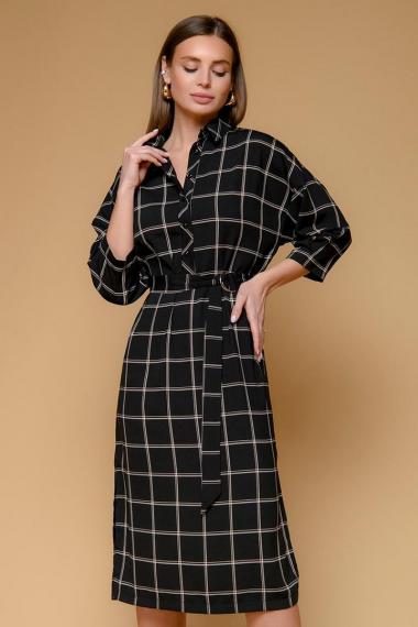 Платье-рубашка в клетку длины миди с отложным воротником и поясом 1001 DRESS